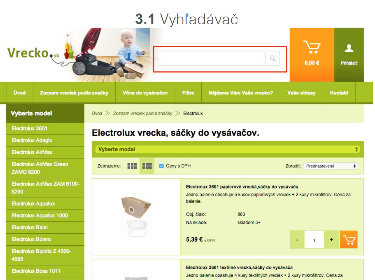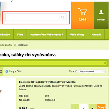 Vyhľadávanie produktov pomocou integrovaného vyhľadávača.