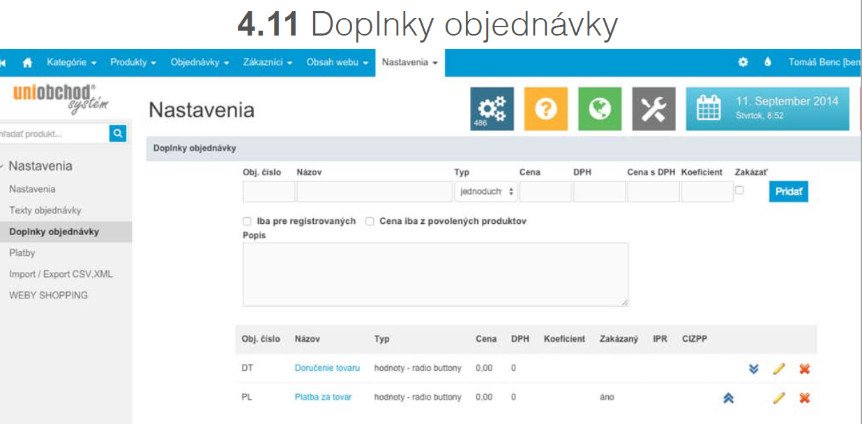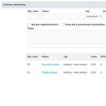 Doplnky môžu byť nadefinované s prirážkou (poplatkom) k objednávke alebo zadarmo.