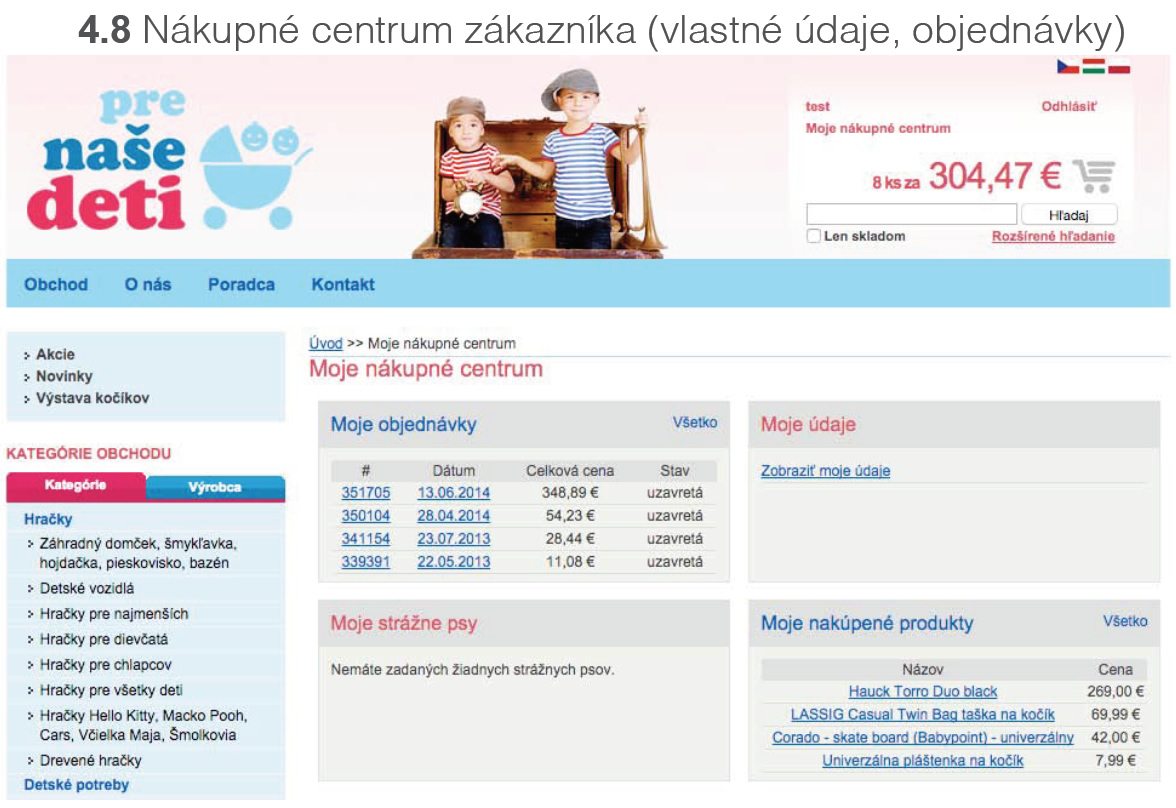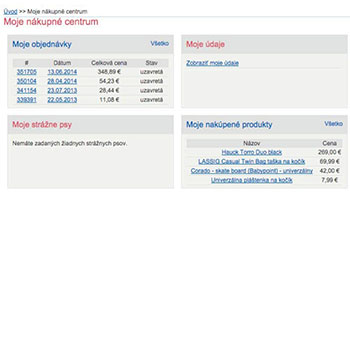 vidí všetky svoje objednávky, môže si tu spravovať svoje údaje, vidí