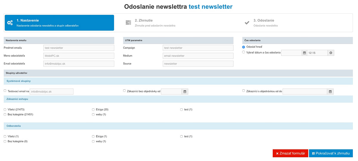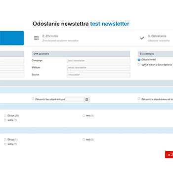 Je možné nastaviť si pre každé odoslanie newslettra individuálne: predmet mailu, odosielateľ mailu, adresa pre odpovede, UTM parametre (Čo je to UTM parameter?).