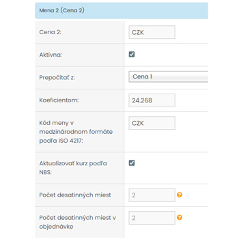 V sekcii Mena 2 (Cena 2) sa nachádza prepínač "Aktívna", ktorým sa zapína alebo vypína používanie tejto druhej meny. Po aktivácii systém začne pracovať s alternatívnou menou a zobrazovať ju tam, kde je to nastavené (napr. produkt, košík, detail produktu).