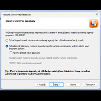 red vykonaním importu si zálohujte existujúcu databázu firmy povelom Zálohovať z ponuky Súbor/Zálohovanie tak ako to radí aj POHODA.